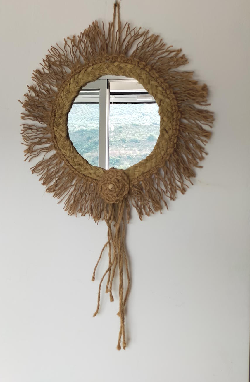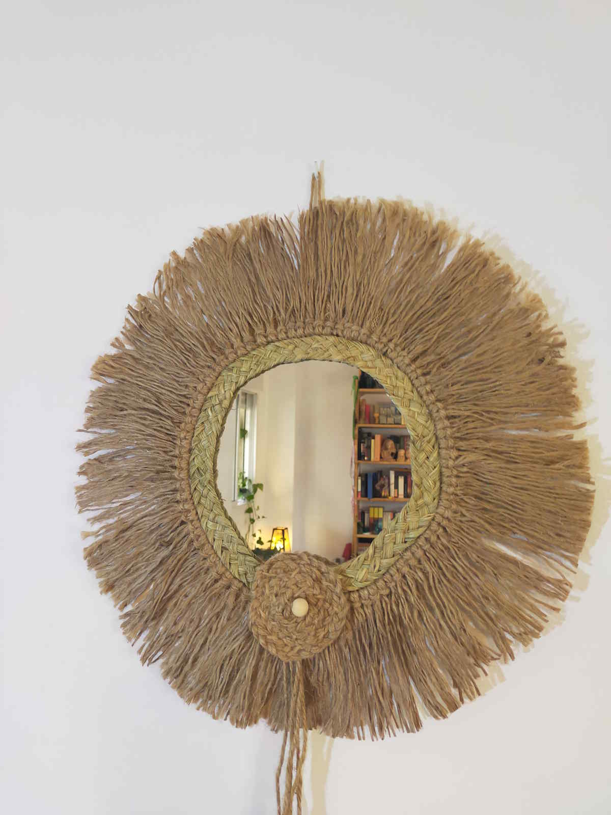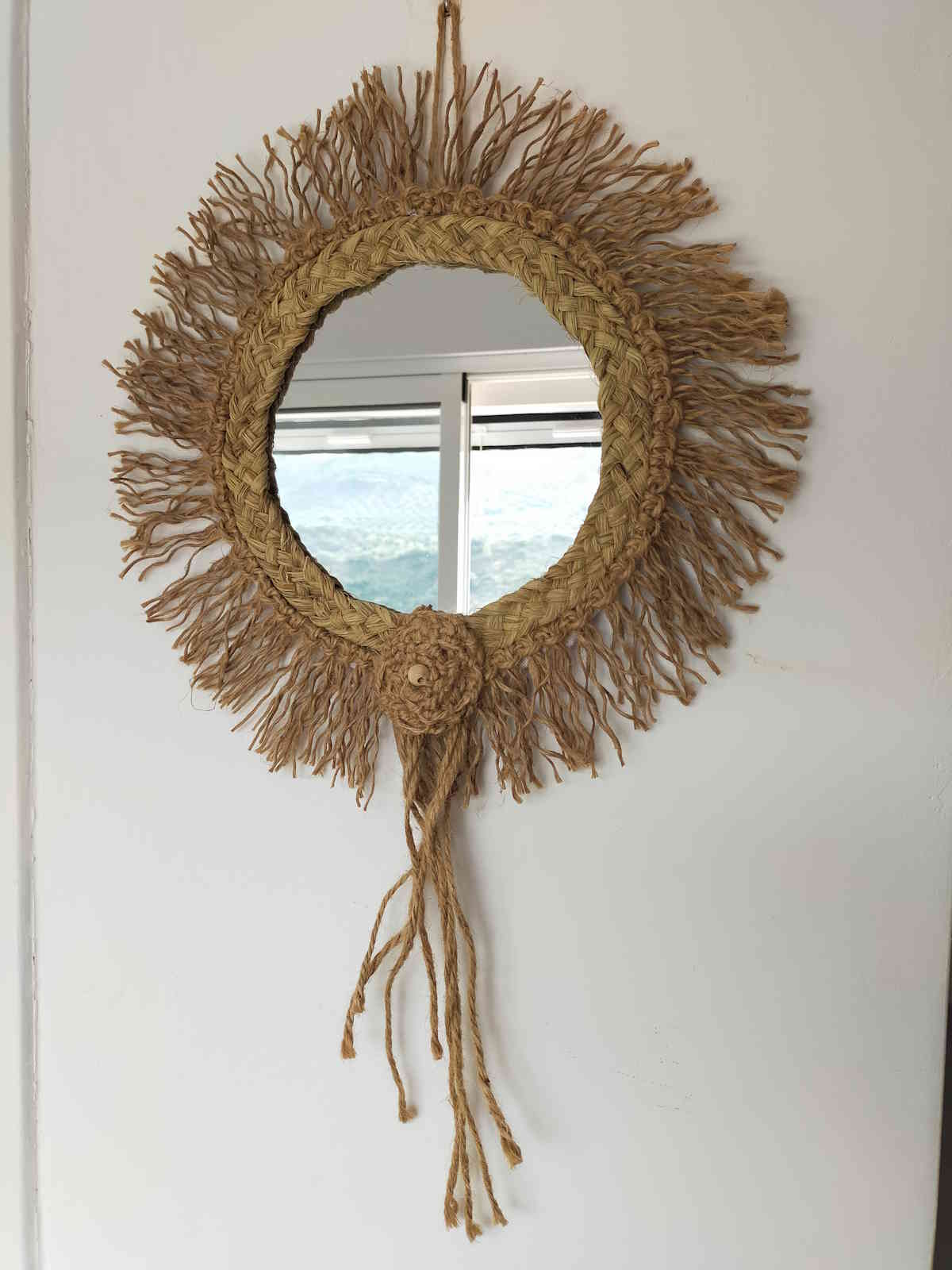 El espejo sol de yute puede reflejar tus amaneceres más inspiradores. Junto con la trenza de cinco ramales de esparto , que se cierra bajo el detalle de yute circular . Deja que llene de luz tu hogar.