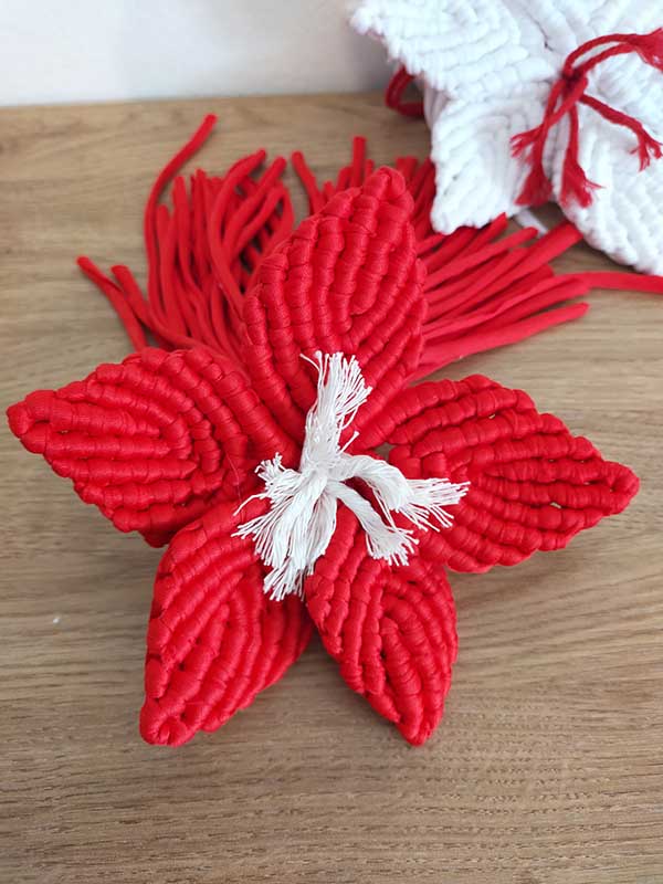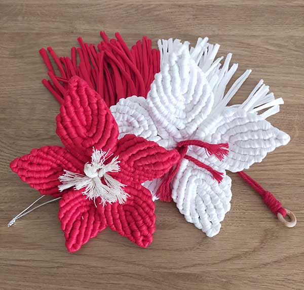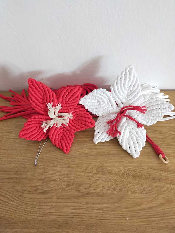rojo intenso, cientos de nudos hechos a mano, estambres en blanco natural, y cuerda para colgar . Puedes disfrutar de esta flor de hibisco para todas las navidades que desees. También puedes encontrarla dentro del PACK NAVIDAD.