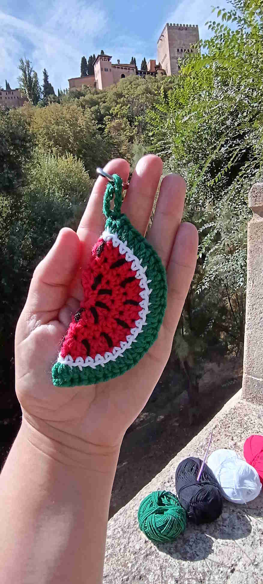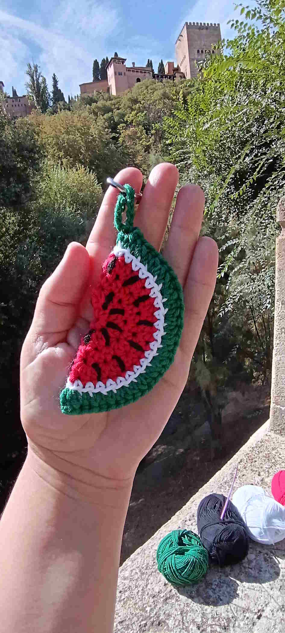 Llavero con forma de sandía, tejido a crochet. Con mucho mensaje, podrás colgarlo en tus llaves, en tu bolso o mochila o dónde quieras