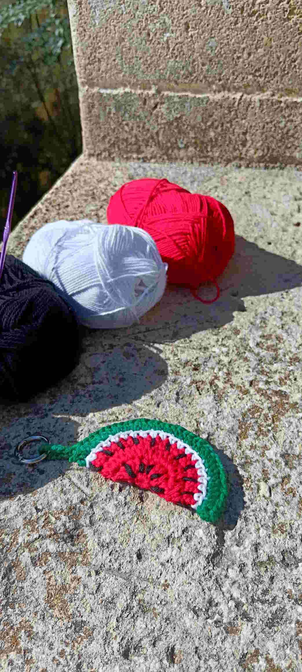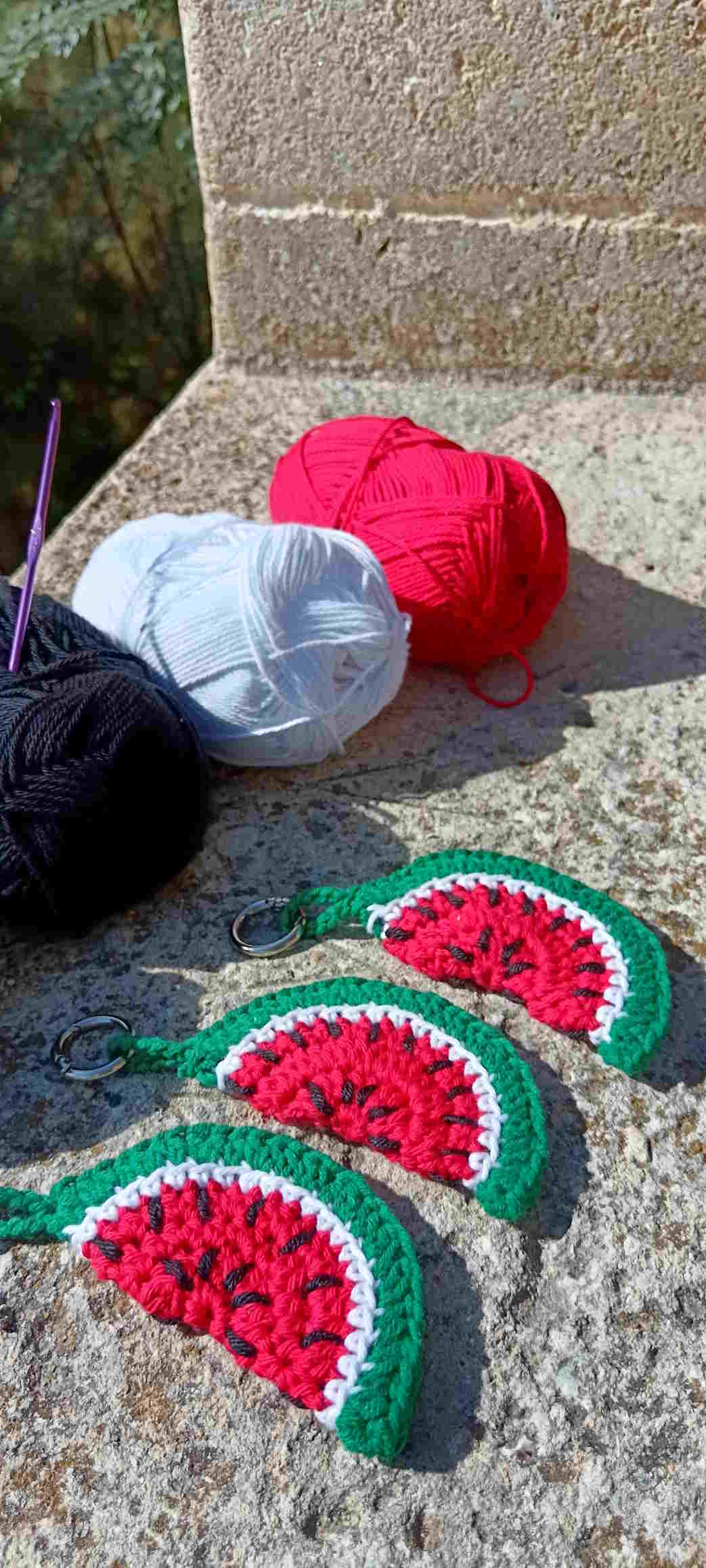 Llavero con forma de sandía, tejido a crochet. Con mucho mensaje, podrás colgarlo en tus llaves, en tu bolso o mochila o dónde quieras.