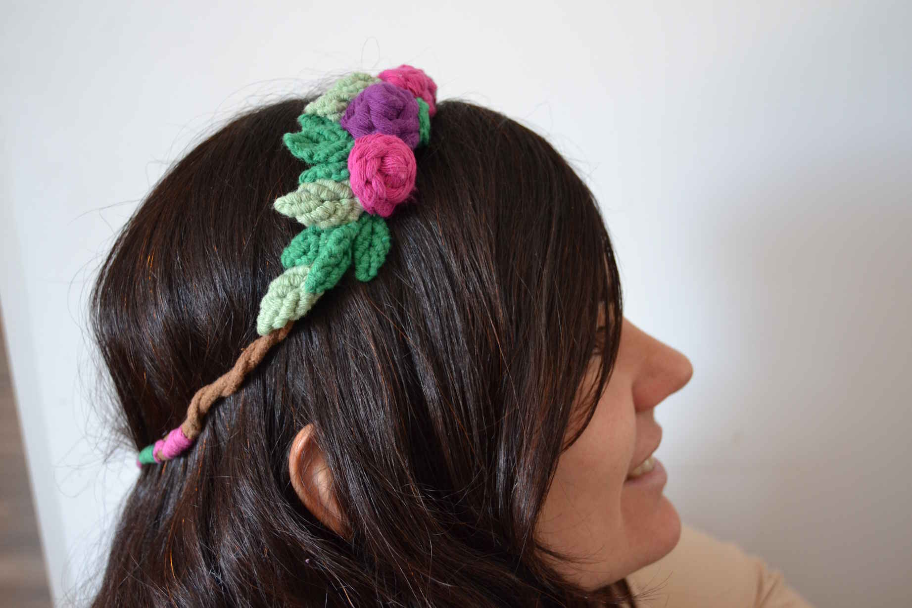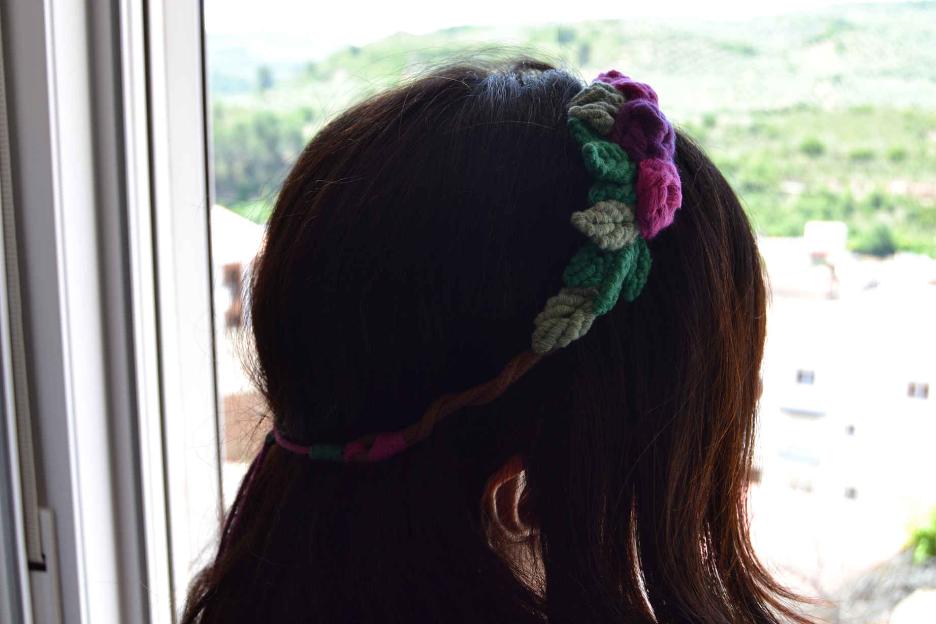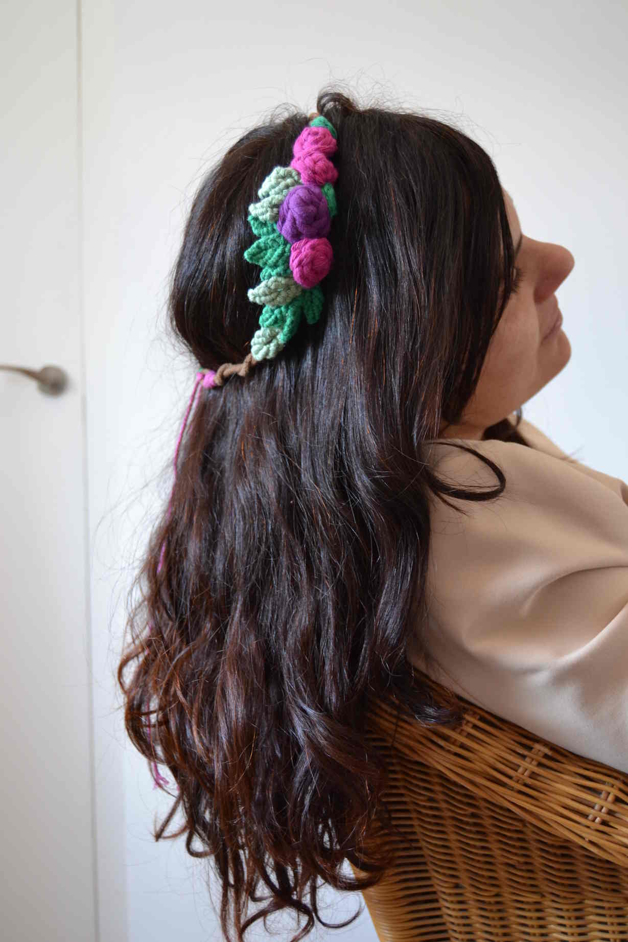 Inspirada en el arbusto con el mismo nombre, la Tiara Buganvilla transmite la frescura floreada de los jardines en primavera. Delicada flores y hojas de algodón, en diferentes tonos , igual que en la naturaleza. La estructura es ligeramente moldeable, y ajustable con la cuerda posterior. Llénate de flores con esta tiara. Hecho a mano, como todo en Pamplinas