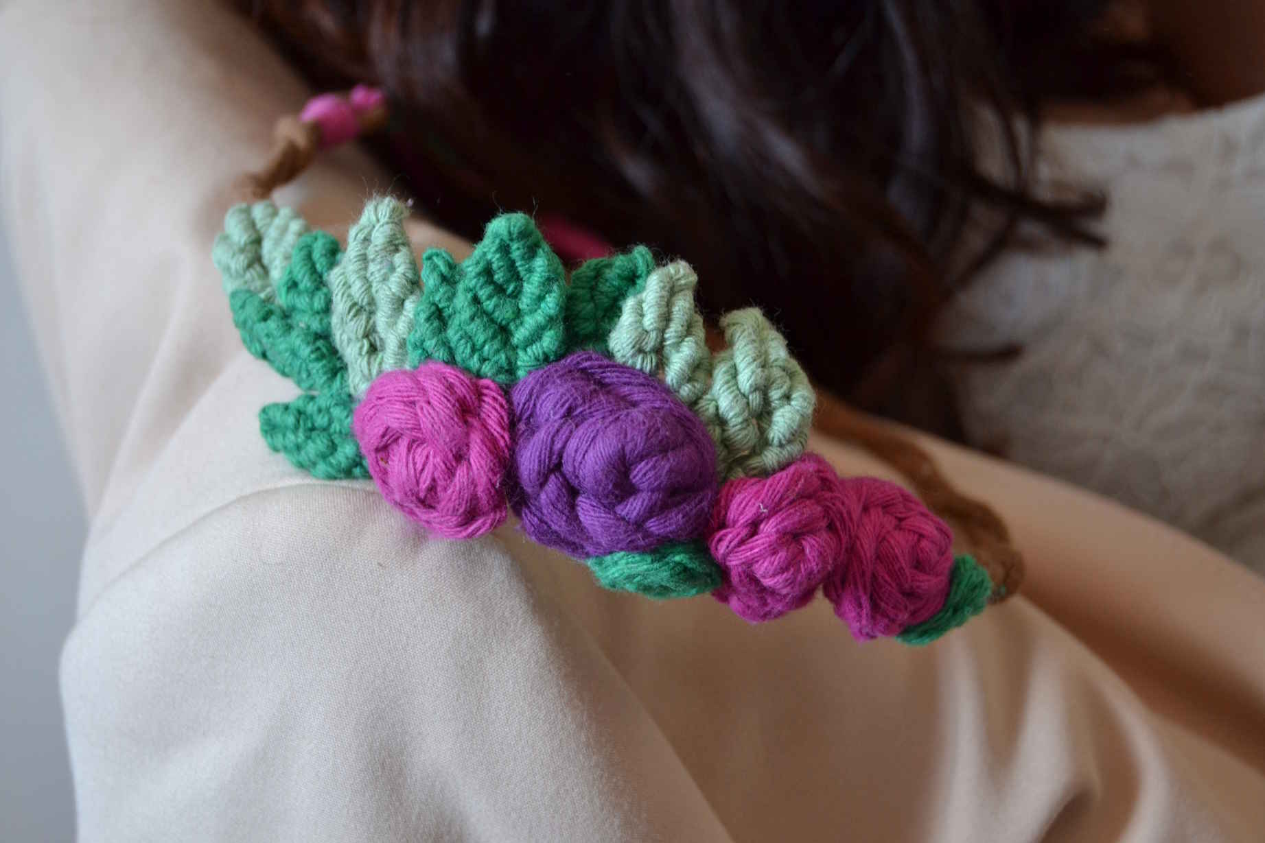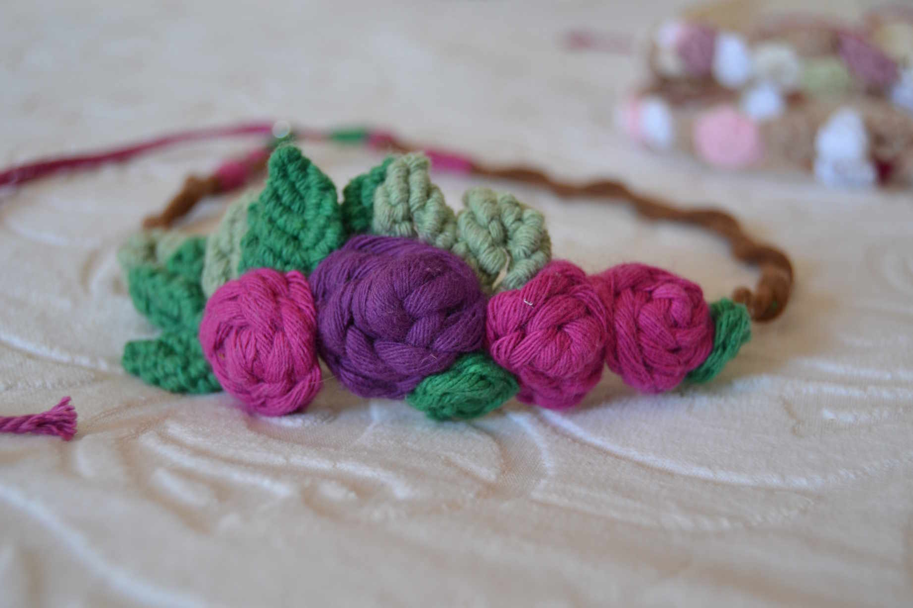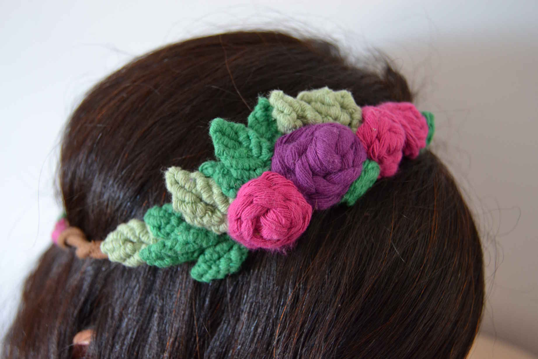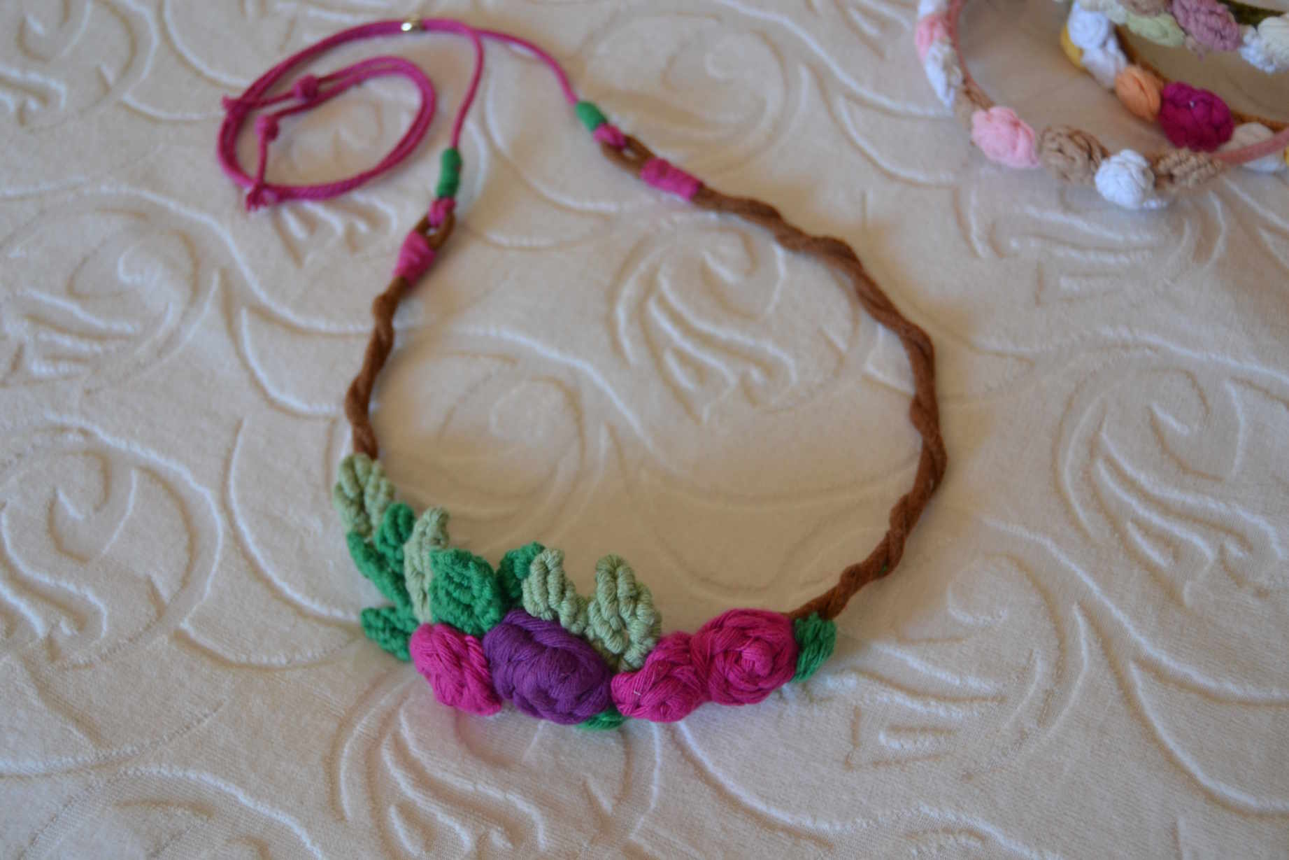 Inspirada en el arbusto con el mismo nombre, la Tiara Buganvilla transmite la frescura floreada de los jardines en primavera. Delicada flores y hojas de algodón, en diferentes tonos , igual que en la naturaleza. La estructura es ligeramente moldeable, y ajustable con la cuerda posterior. Llénate de flores con esta tiara. Hecho a mano, como todo en Pamplinas